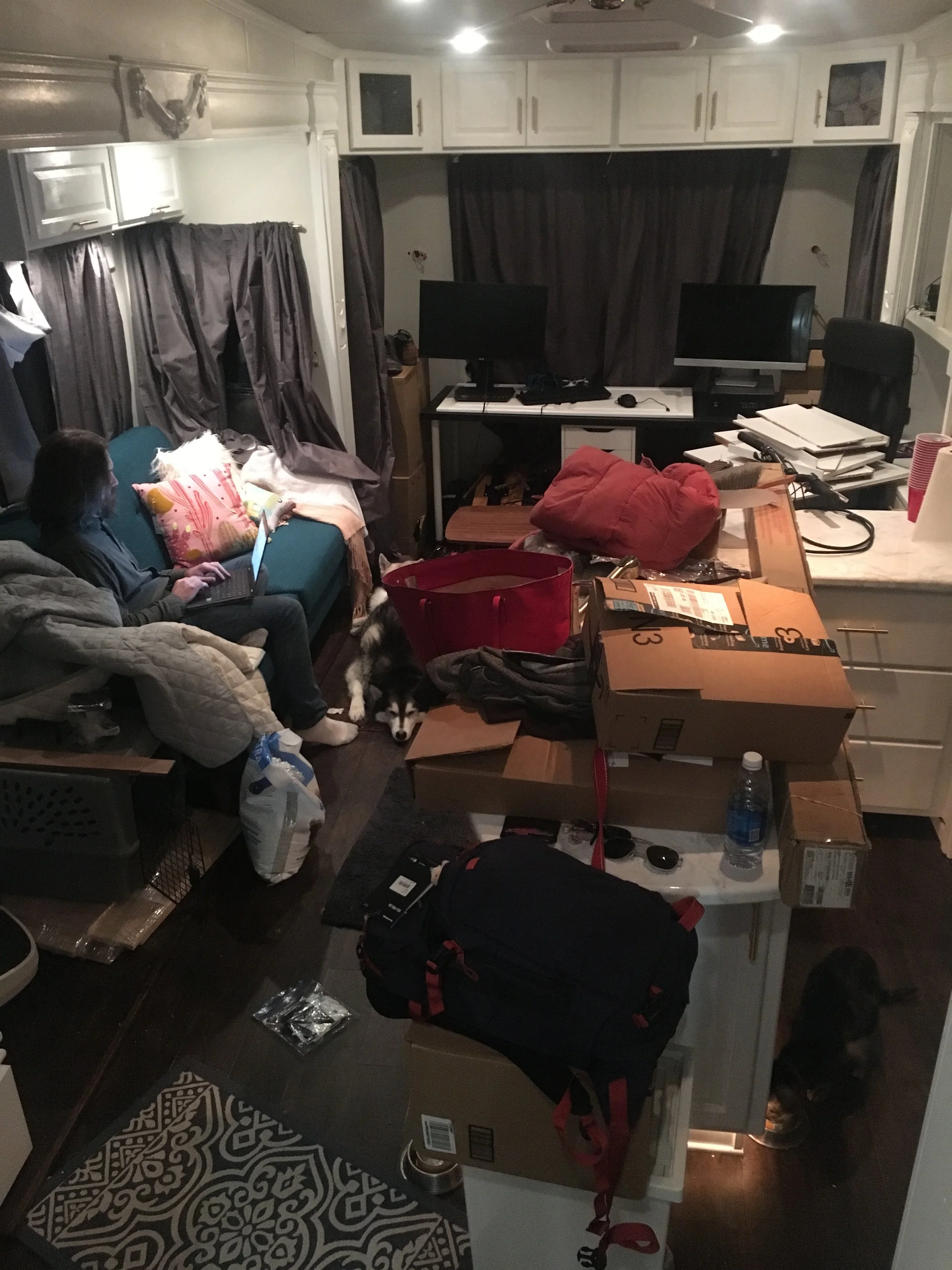 We'd made the decision to hit the road for California (from Arizona, where we'd been remodeling the house-on-wheels) a little late, and we somewhat underestimated the amount of work left to do to finish up our work. As a result, the trailer was a bit of a disaster: